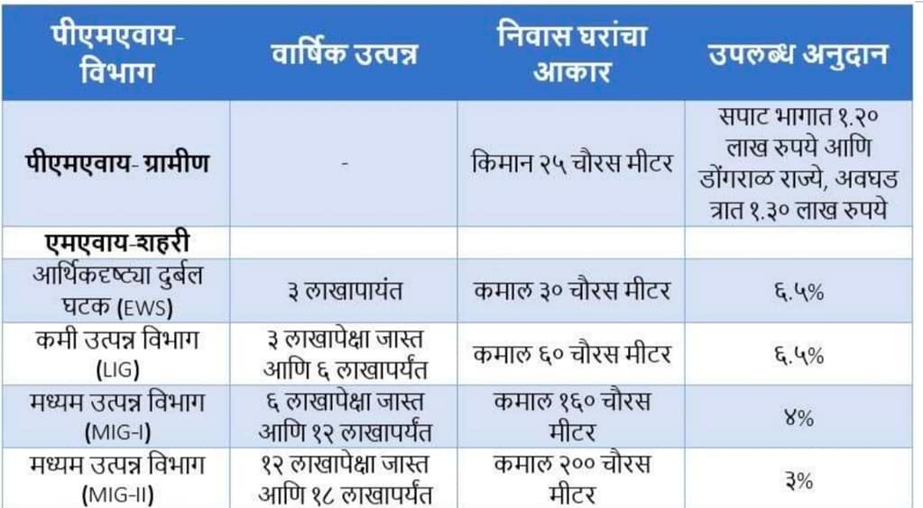 क्रेडिट-लिंक सब्सिडी योजना (CLSS): नवीन घरे बांधण्यासाठी किंवा सध्याच्या घरांच्या नूतनीकरणासाठी ६ लाख ते १२ लाख रुपयांच्या गृहकर्जावर कमी व्याजदरावर केंद्रीय अनुदानाची तरतूद करते. ६ लाखापर्यंत कर्ज सवलत.